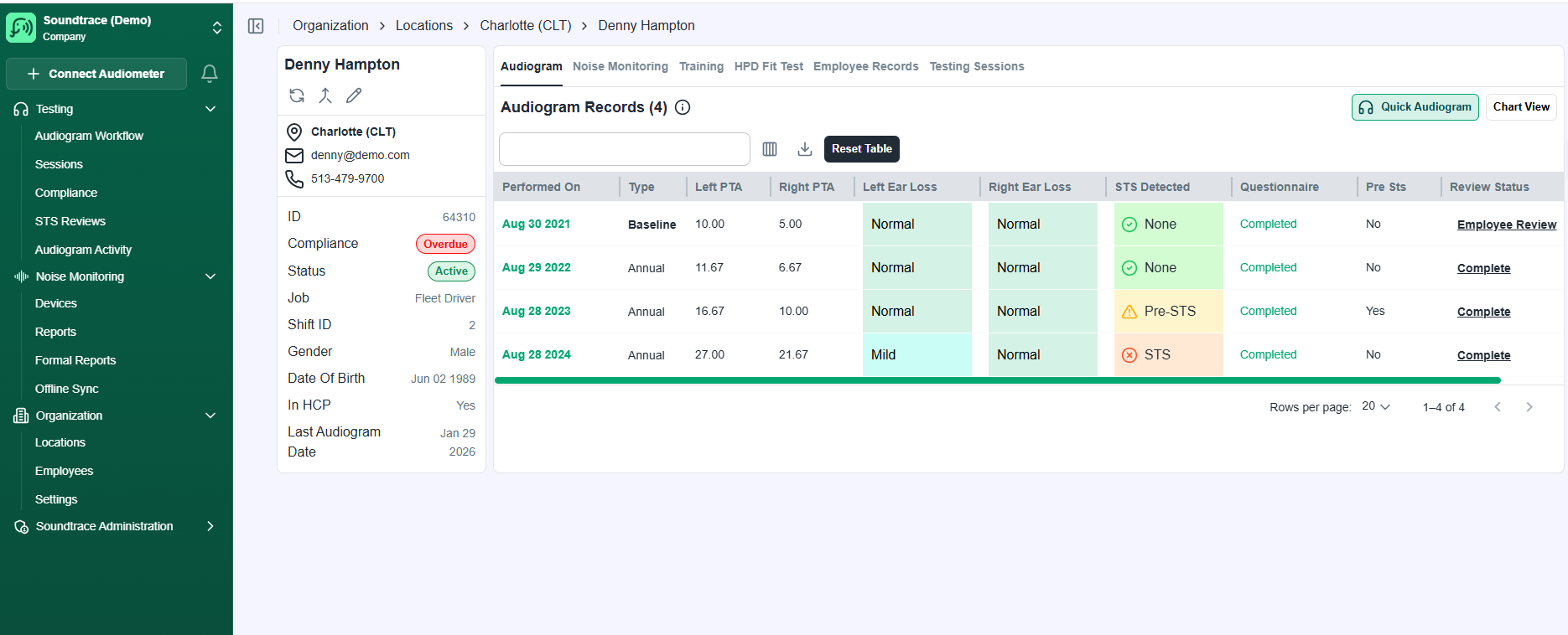 Each test layers onto the employee's longitudinal profile. Hearing trends, STS history, and compliance status - all automatic.