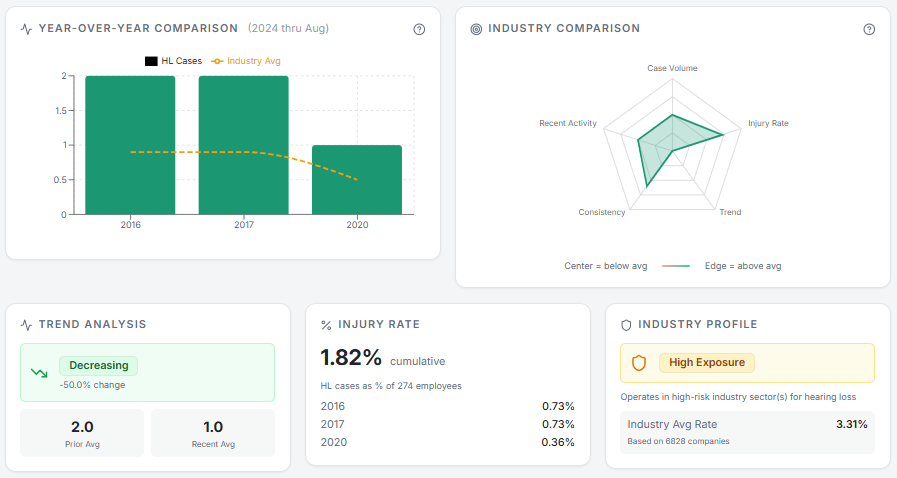 Compare your injury rate, case volume, and trend against companies in your same NAICS industry classification.