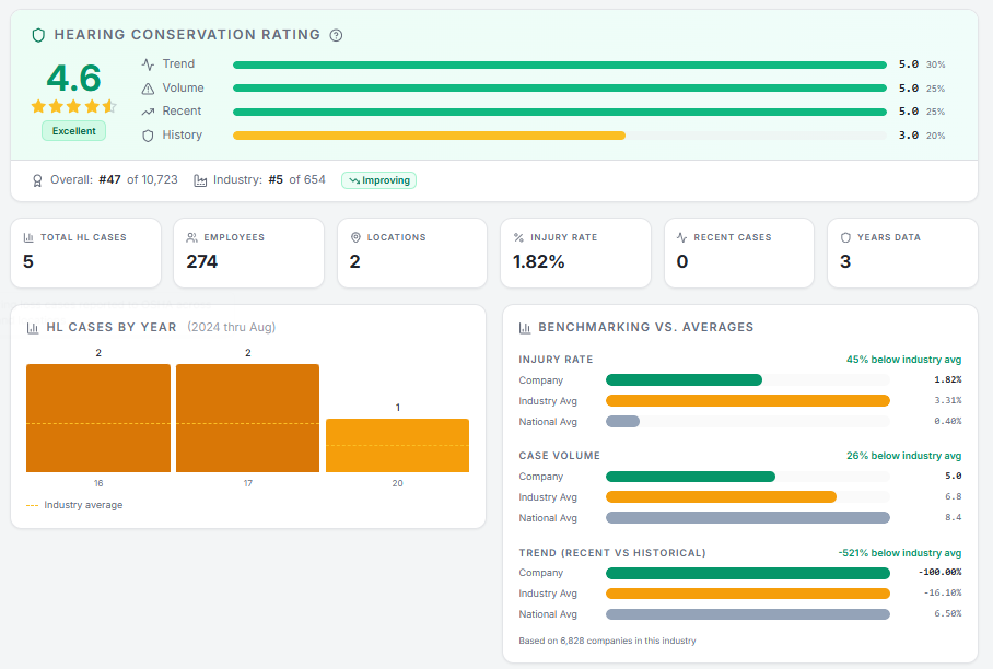 This construction company demonstrates excellent hearing conservation practices. With a 4.6 rating and zero recent cases, they rank in the top 1% of all companies and top 1% of their industry. Their injury rate is nearly half the industry average.