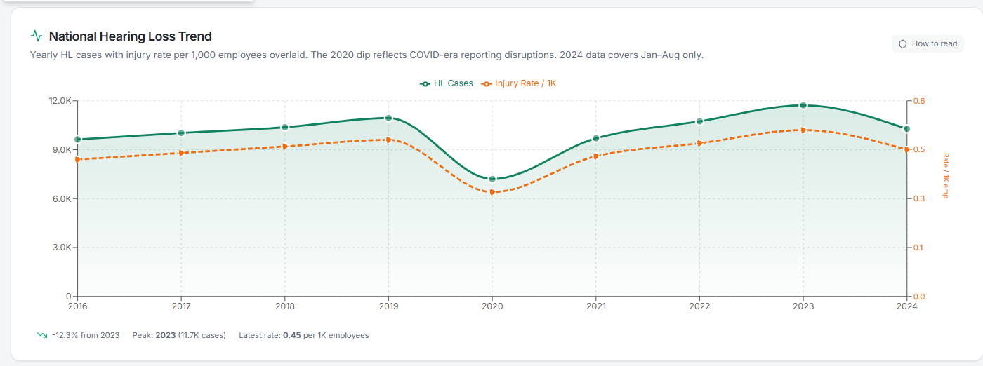 Yearly hearing loss cases with injury rate per 1,000 employees overlaid. The 2020 dip reflects COVID-era reporting disruptions. 2024 data covers Jan–Aug only.